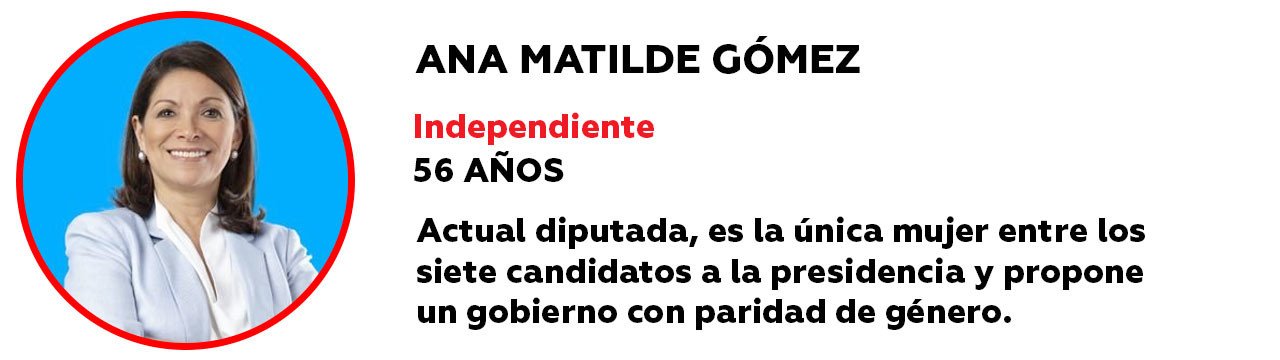Única presencia femenina en la lista de candidatos, Ana Matilde Gómez es abogada y licenciada en ciencias políticas. Ha ejercido diversos cargos en el ámbito público en el área del derecho. En el 2004, fue designada como Procuradora General de la Nación, siendo la primera mujer en acceder a ese cargo en 102 años de historia del país.