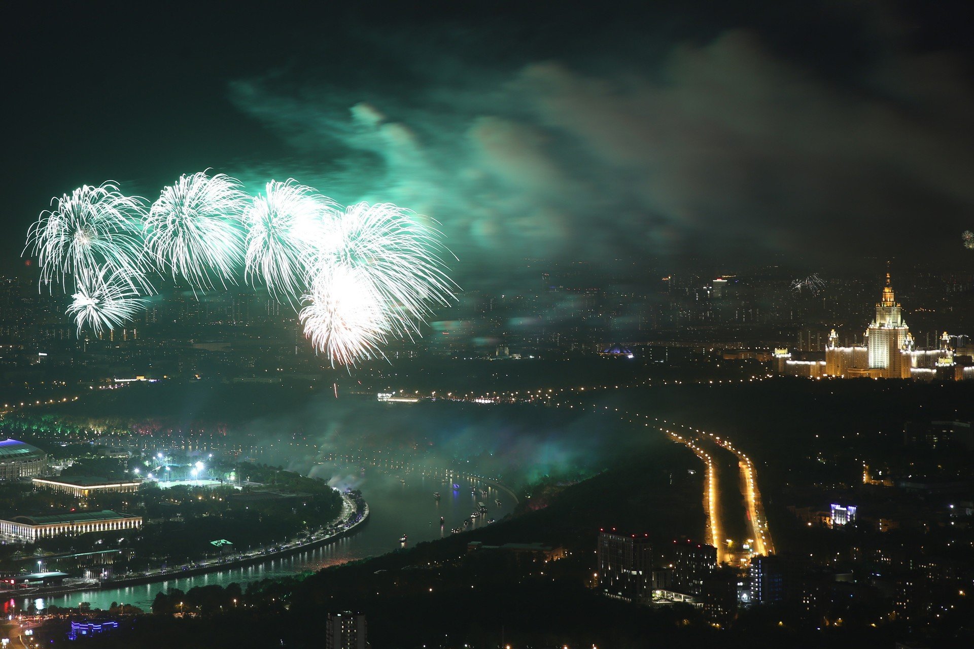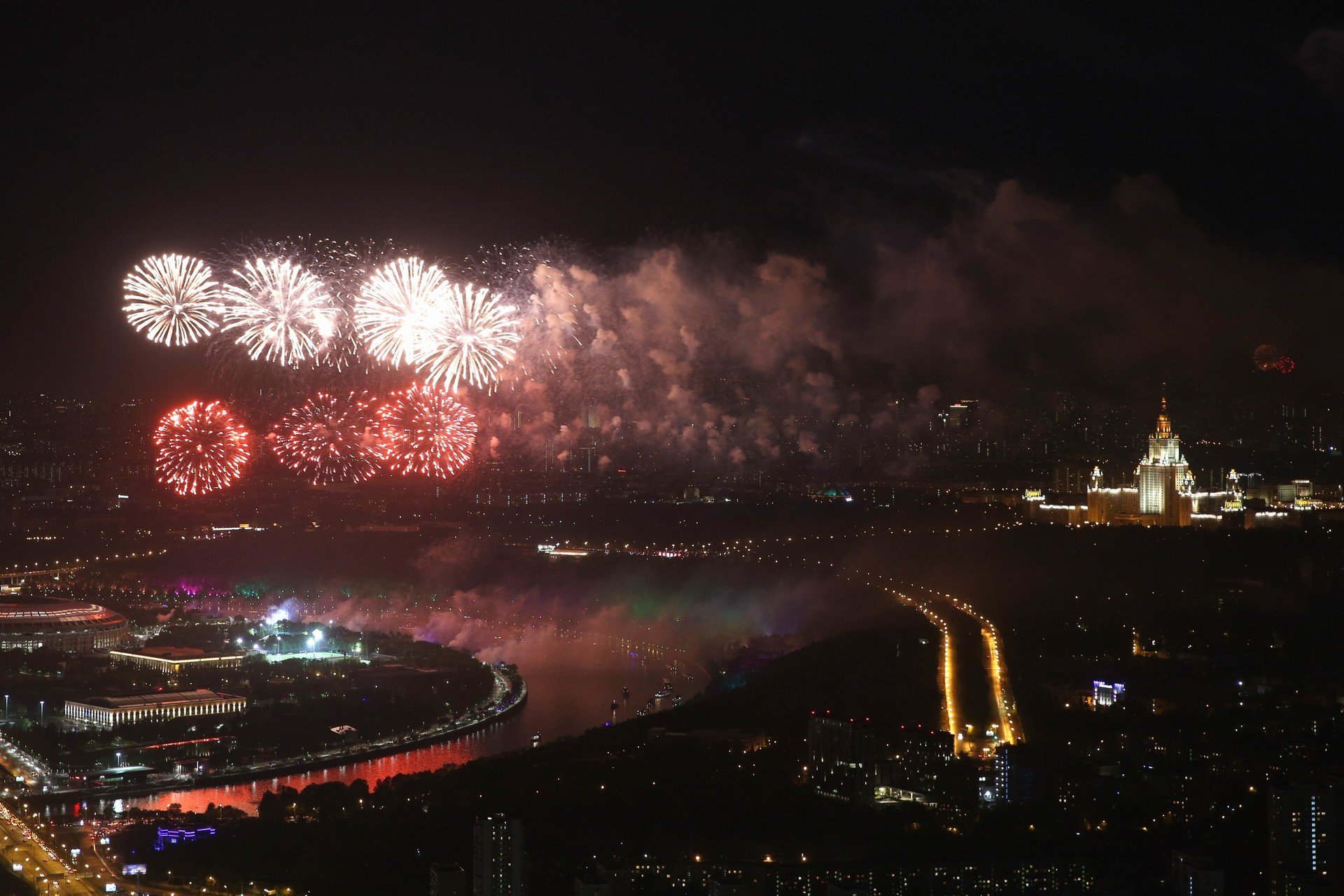 El Ayuntamiento de Moscú preparó más de 30 plataformas para el espectáculo pirotécnico, principalmente en los diferentes parques de Moscú, tales como el emblemático parque Gorki o el parque de la Victoria y también el estadio Luzhnikí.