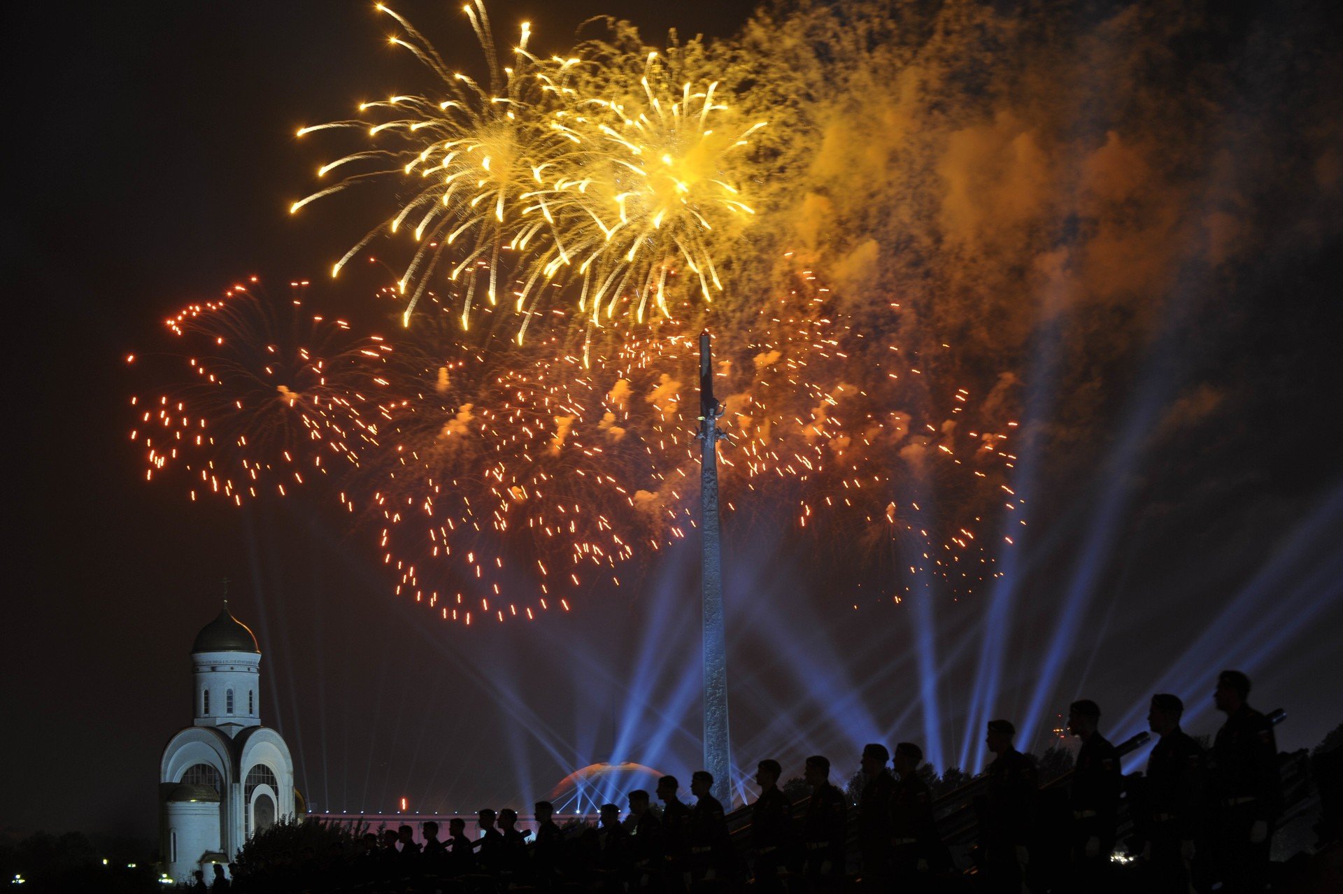 La tradición de lanzar fuegos artificiales tiene su origen en el año 1943. El comandante en jefe del Ejército Rojo, Iósif Stalin, ordenó organizar una celebración en Moscú con el uso de pirotécnica en honor a la liberación de las ciudades de Bélgorod y Oriol.