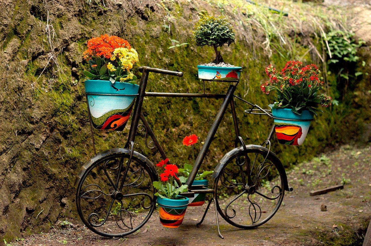 Además de las macetas, García ha incursionado también en los portamacetas, con piezas no convencionales, como carretas, árboles, bicicletas, entre otros; son hechos de hierro forjado.