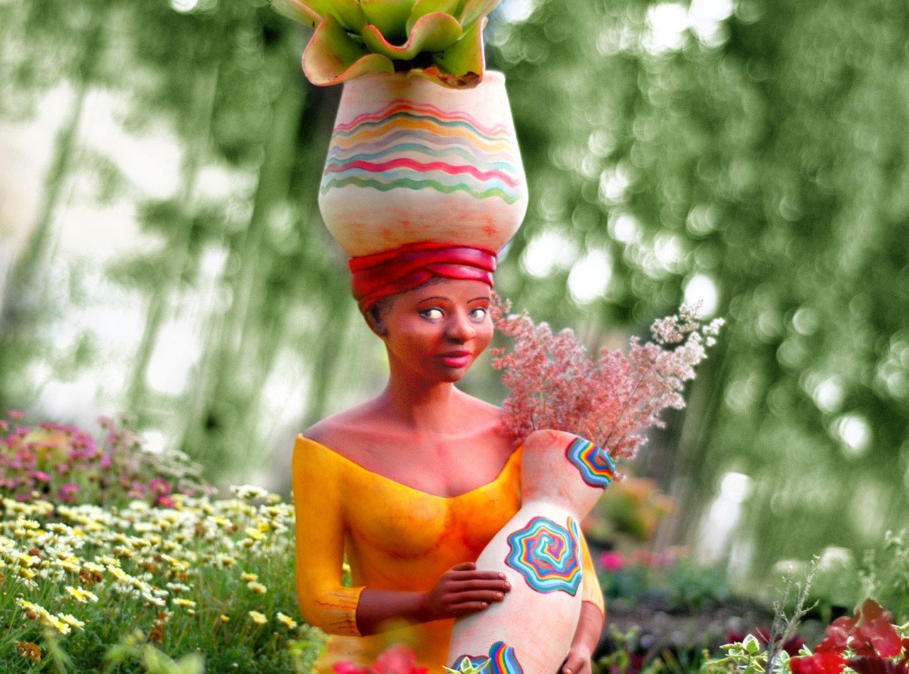 La pintora le propuso que, en lugar de hacer el dibujo literalmente como aparecía en la foto, podía pintar a la mujer "como que está en la arena de la playa, mirando el horizonte y el mar, y no se está sacando la camiseta sino que está como arropándose con un pañuelo, pero aún se le ve su parte trasera". El hombre aceptó y una semana después llama a la artista: "¿Ya hizo la maceta?", le pregunta, y señala: "Quiero un cambio, no le haga rubia, como aparece en la foto, hágale morena".