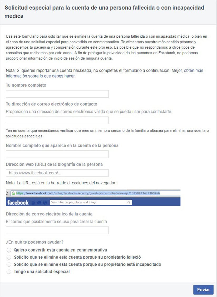 Todos estos cambios se pueden impulsar a través de la opción 'Solicitud especial para la cuenta de una persona fallecida o con incapacidad médica', donde se deben completar los datos propios y los de la persona involucrada y así decidir si se pretende hacer que la cuenta se vuelva conmemorativa, se elimine por fallecimiento o por incapacidad, o realizar otra solicitud especial.