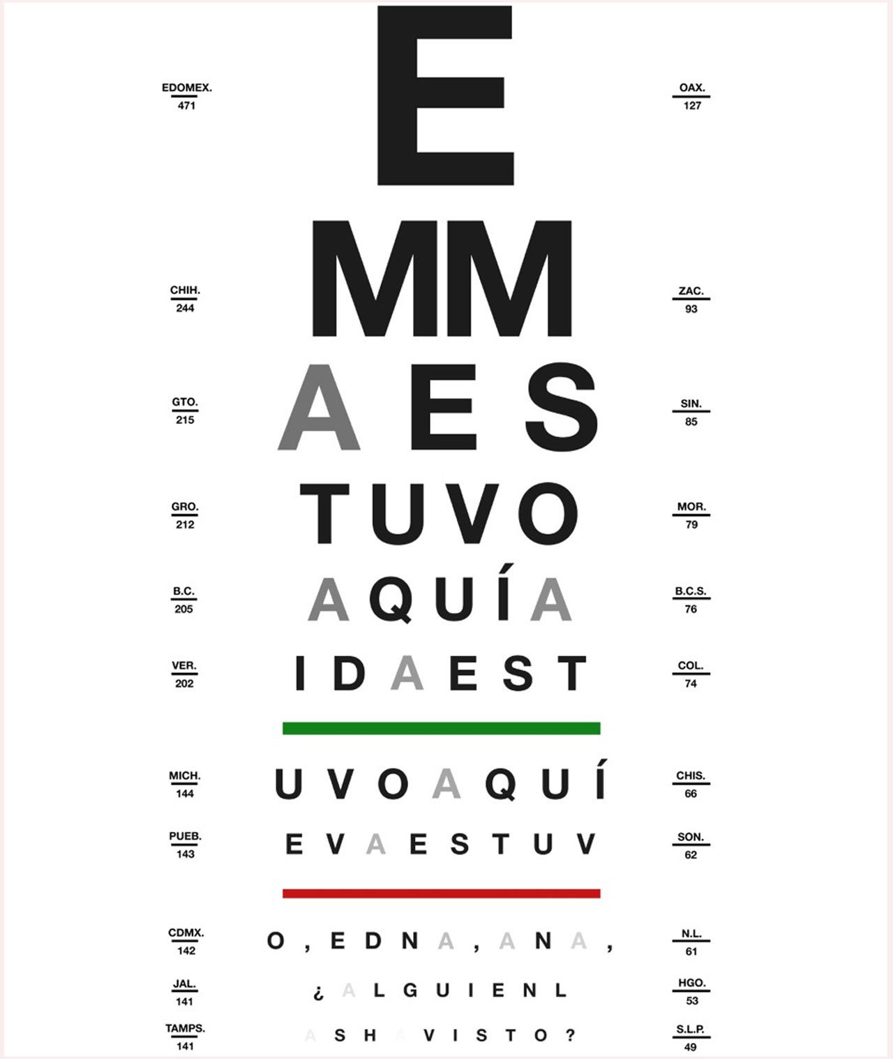 La artista Diana Garza, de Monterrey, en el estado de Nuevo León –entidad que en lo que va de 2019 se ubica en el tercer lugar en la comisión de feminicidios– reta al espectador a través de un cartel que simula un examen de la vista. "De entrada, nos referencia a nuestros problemas de ceguera, un problema que está presente, pero no lo vemos o no lo queremos ver, y de pronto empieza a desaparecer las 'a' y termina con nombres de mujeres que se van borrando",refiere Yunuen.