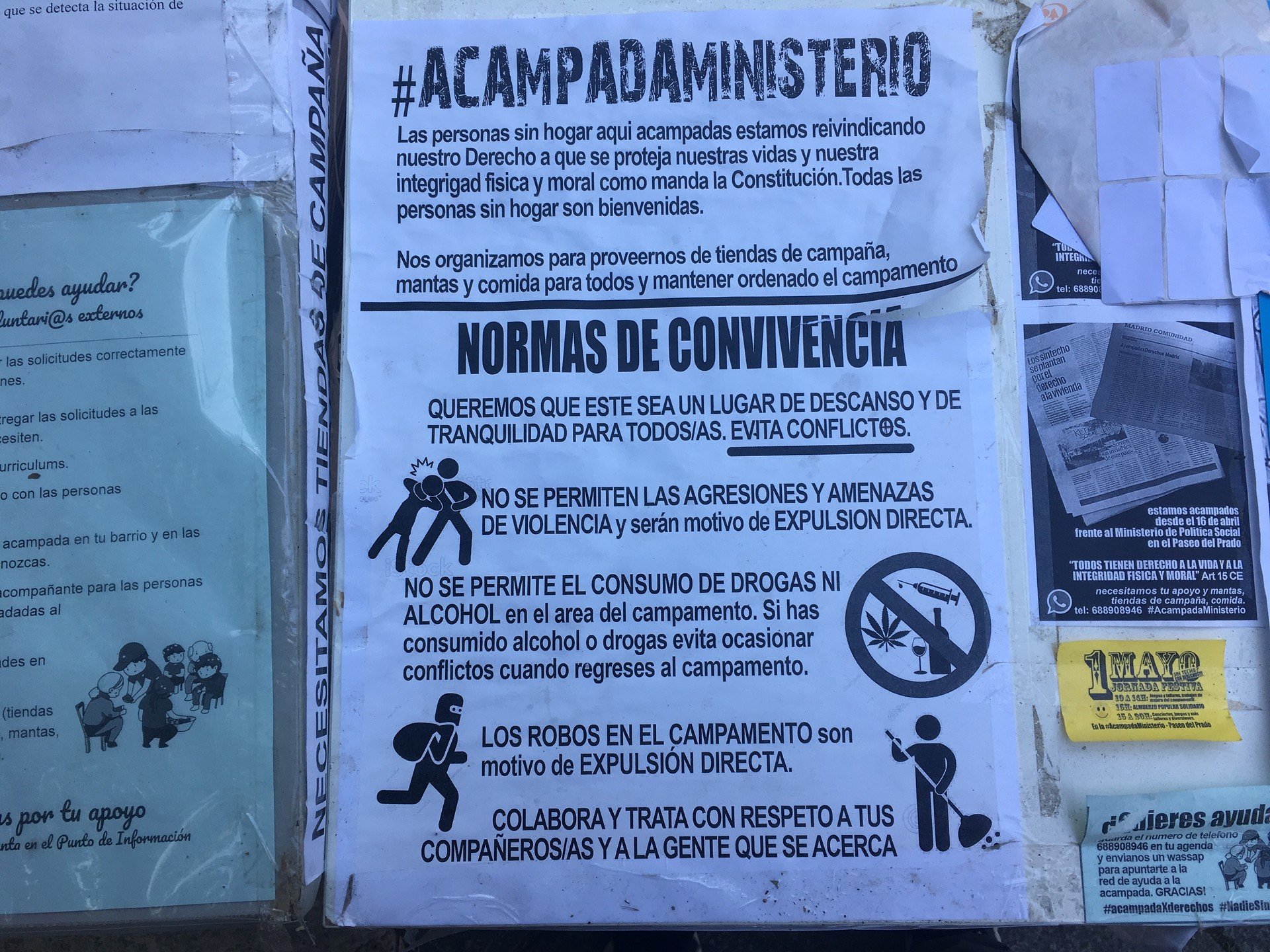 Los sintecho reunidos en este acto de protesta tienen clara su intención de habilitar "un lugar de tranquilidad", por lo que los conflictos han de evitarse a toda costa. Las agresiones y amenazas de violencia, así como los robos, serán motivos de expulsión directa. El alcohol y las drogas tampoco están permitidos en este lugar.