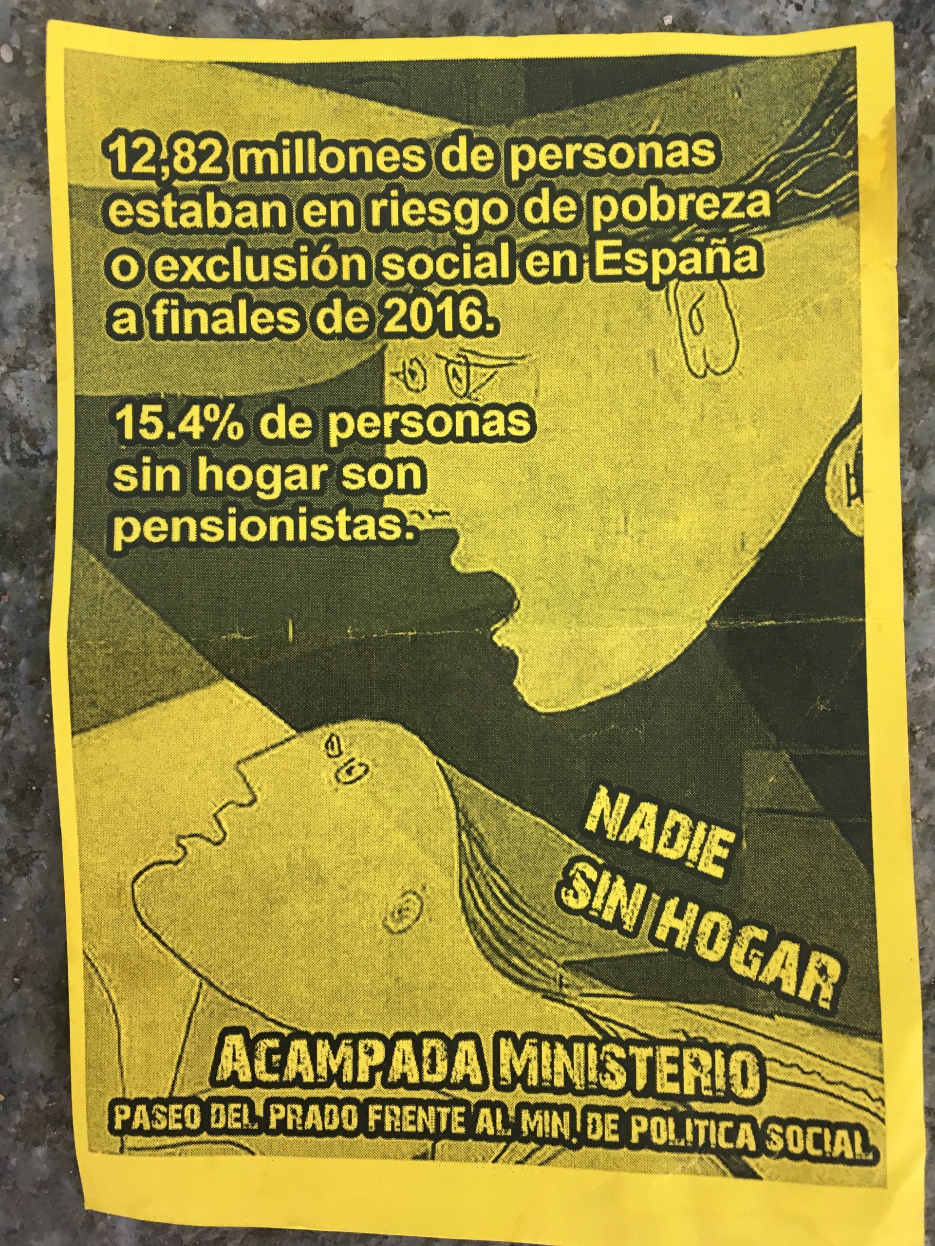 Para Angie es importante entender "cómo están las cosas hoy en día en España". "No nos podemos permitir un alquiler, los sueldos son insuficientes especialmente cuando se tienen hijos y, si eres mayor, a veces las pensiones no alcanzan a cubrir las necesidades básicas", asegura. En los carteles que hay colocados a lo largo del bulevar puede leerse que el 15 % de las personas sintecho en España son, precisamente, jubilados pensionistas.