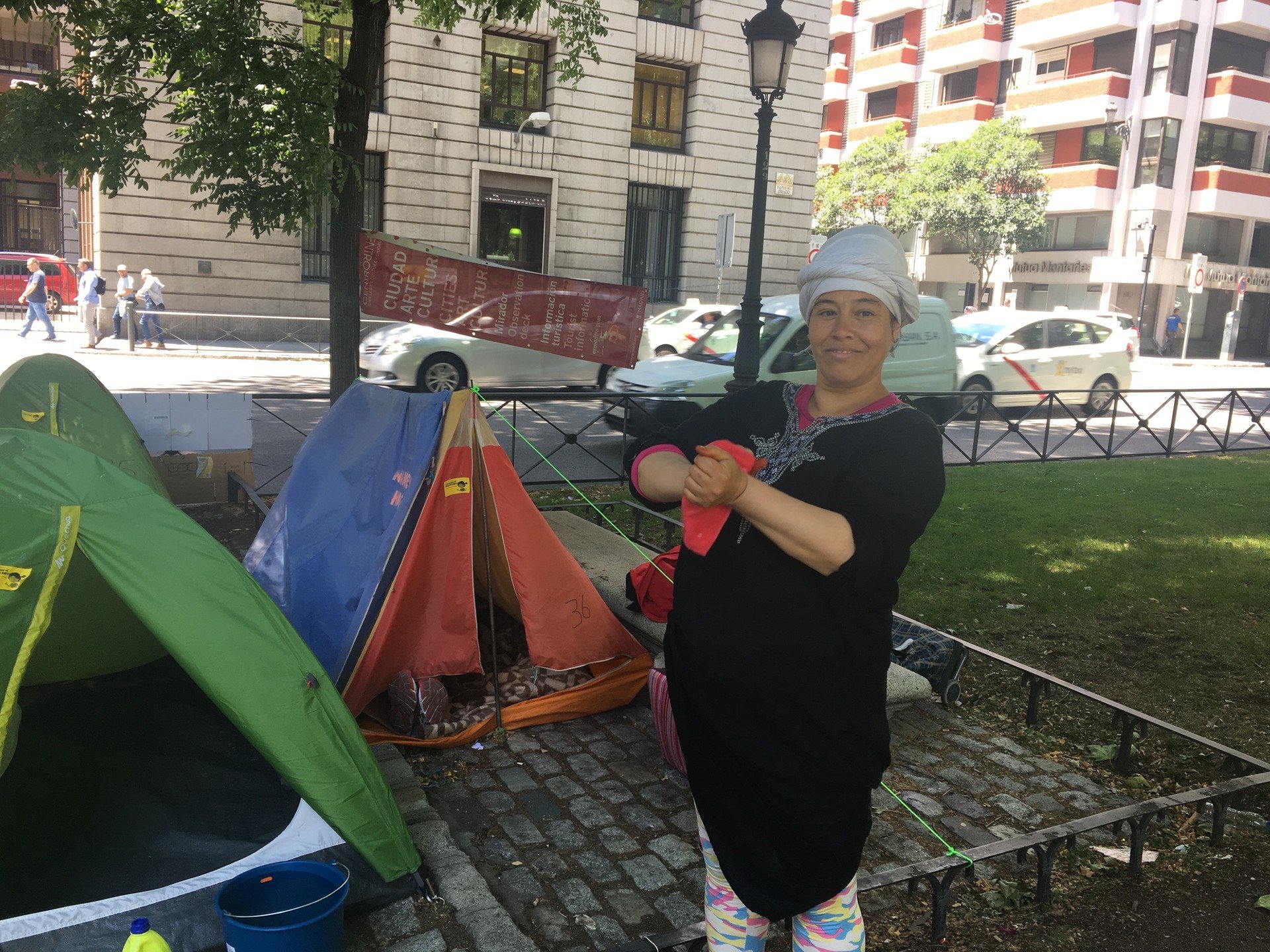 Suraya, una de las pocas personas que tiene su propia tienda de campaña en esta acampada —las demás han sido adquiridas en el mismo establecimiento gracias a diferentes donaciones y son casi todas iguales—, es una refugiada siria que lleva 5 años viviendo en la calle. Ha aprovechado esta protesta colectiva para dormir más acompañada. Hasta ahora vivía en la Plaza Mayor, uno de los puntos de la capital española en los que se registra una mayor concentración de indigentes y personas sin hogar al caer la noche.