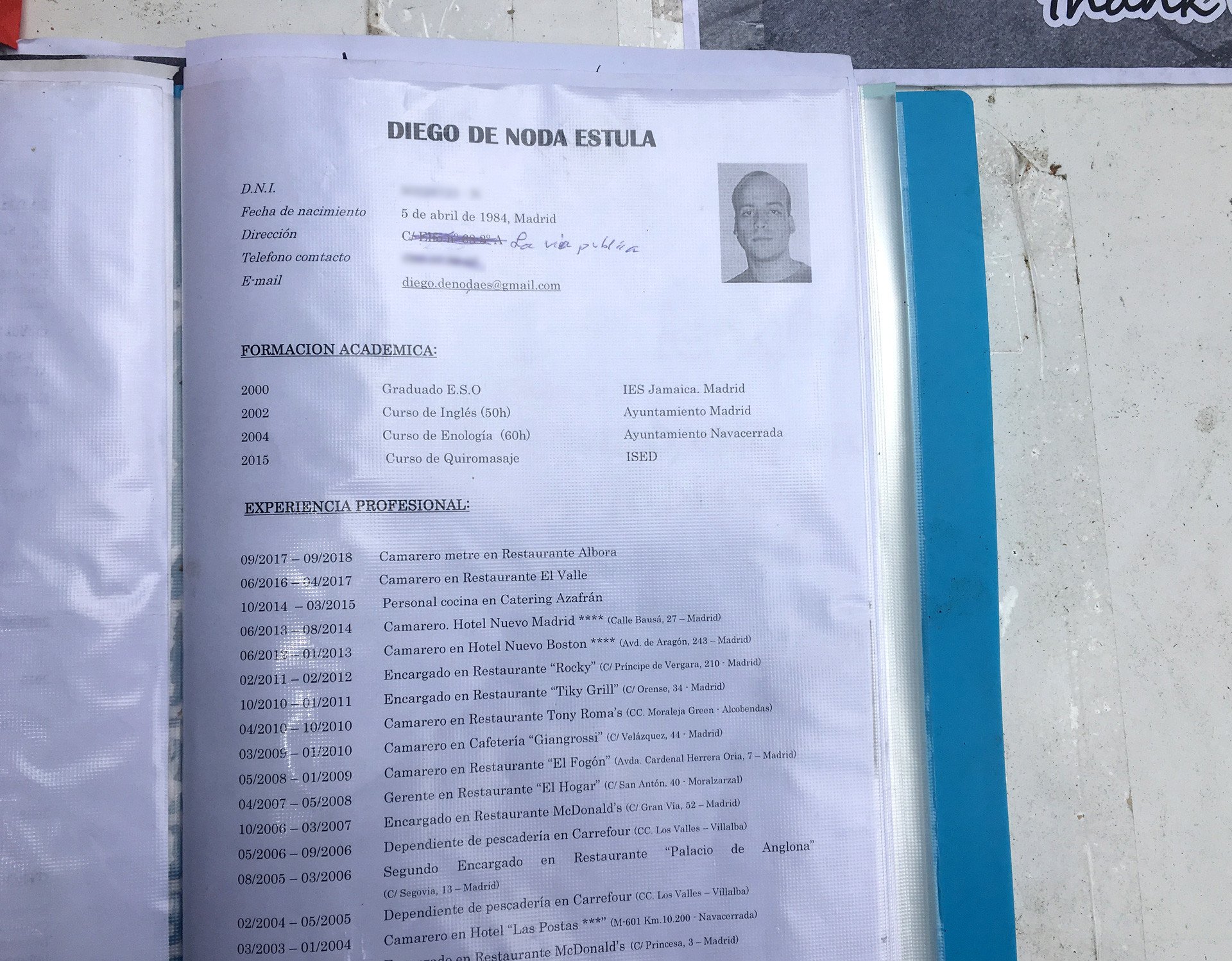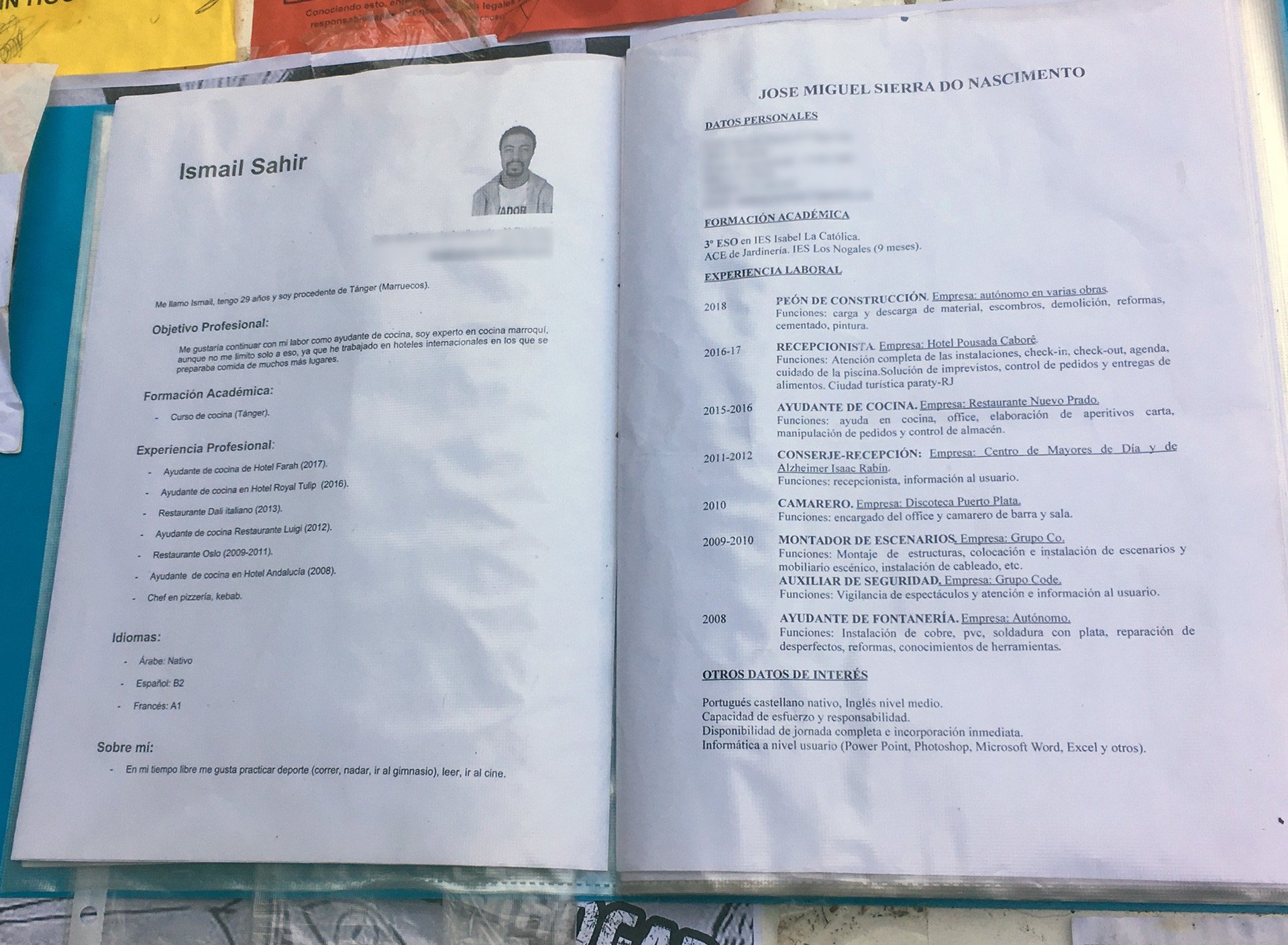 El curriculum de Diego está en el mostrador, en un dosier plastificado en el que figuran también los de muchas de las personas sin hogar reunidas aquí: camareros, obreros de la construcción, recepcionistas de hotel, albañiles, fontaneros, y hasta un trabajador social; personas que, por distintas circunstancias, perdieron el sostén de la sociedad y cayeron en situación de calle.