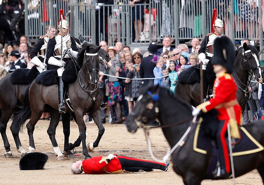 Durante el desfile Trooping the Colour, la ceremonia en honor por el 93.º aniversario de la reina Isabel II en Londres, un oficial montado de la Guardia Irlandesa fue arrojado por su caballo al suelo. La caída ocurrió cuando el animal realizó un movimiento inesperado, según informaron medios locales.