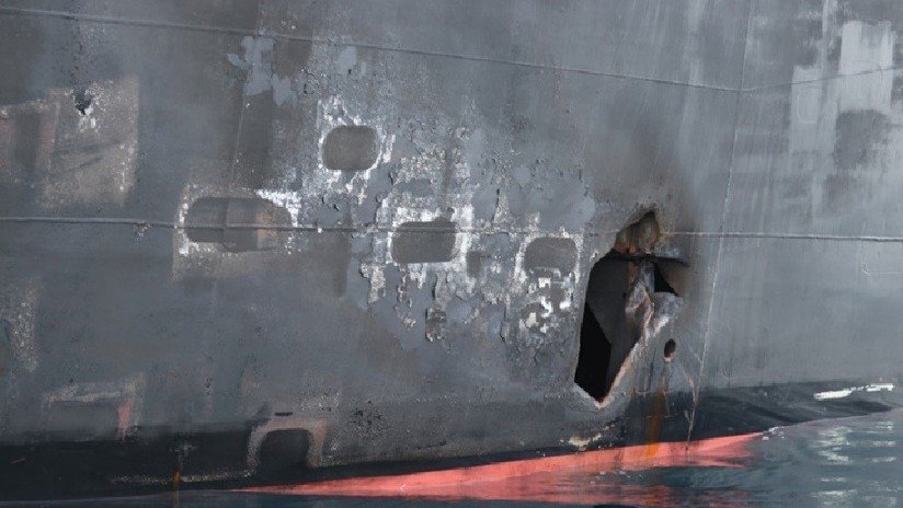 Asimismo, se compartió la fotografía de un agujero en el casco del tanquero que —de acuerdo con el Pentágono— fue producto de la explosión de otra mina.