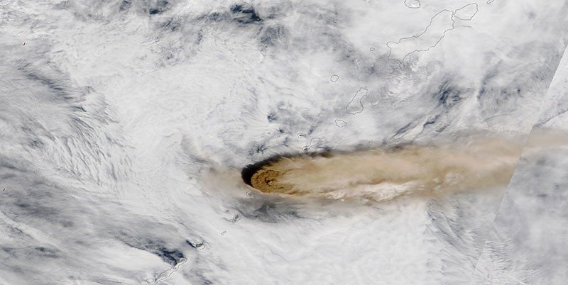 Las imágenes fueron grabadas desde el satélte Terra por un espectrorradiómetro de imágenes de resolución moderada (MODIS, por sus siglas en inglés). Según el Centro de Asesoramiento Volcánico de Cenizas, la nube de gases volcánicos alcanzó una altura de 13 kilómetros, mientras que los datos del satélite Calipso indican que pudo llegar a 17 kilómetros.