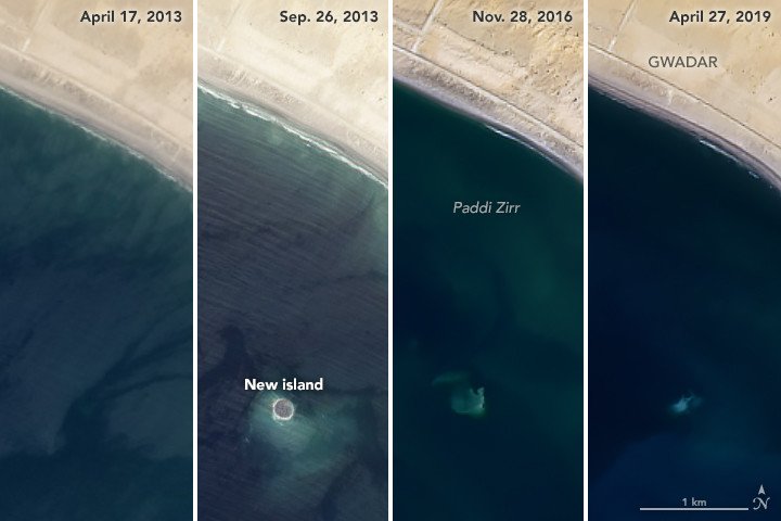 Las imágenes de la NASA, tomadas durante los seis últimos años, muestran varias etapas de vida de 'la isla del terremoto': en abril y septiembre del 2013, noviembre del 2016 y abril del 2019, hasta que fue devorada por las olas y finalmente acabó cubierta por el mar. No obstante, los especialistas señalan que Zalzala Koh no desapareció por completo.