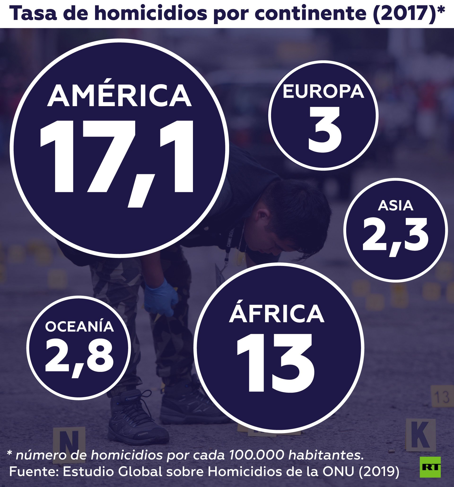 - Por continentes, esa tasa es más alta en América, aunque las cifras internas varían mucho por regiones y países: por ejemplo, hay 62,1 homicidios anuales por cada 100.000 habitantes en El Salvador, mientras Chile solo registra 3,1.