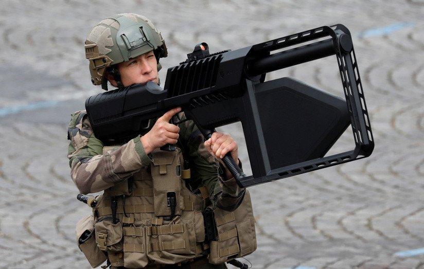 Otra vistosa demostración fue la protagonizada por dos soldados franceses y sendos fusiles antidron (denominados DroneGun), obra de la empresa australiana DroneShield. Este aparato con aspecto de bazuca funciona mediante la interferencia de la señal entre el operador en tierra y un cuadricóptero enemigo, y tiene un alcance de unos 2 kilómetros.