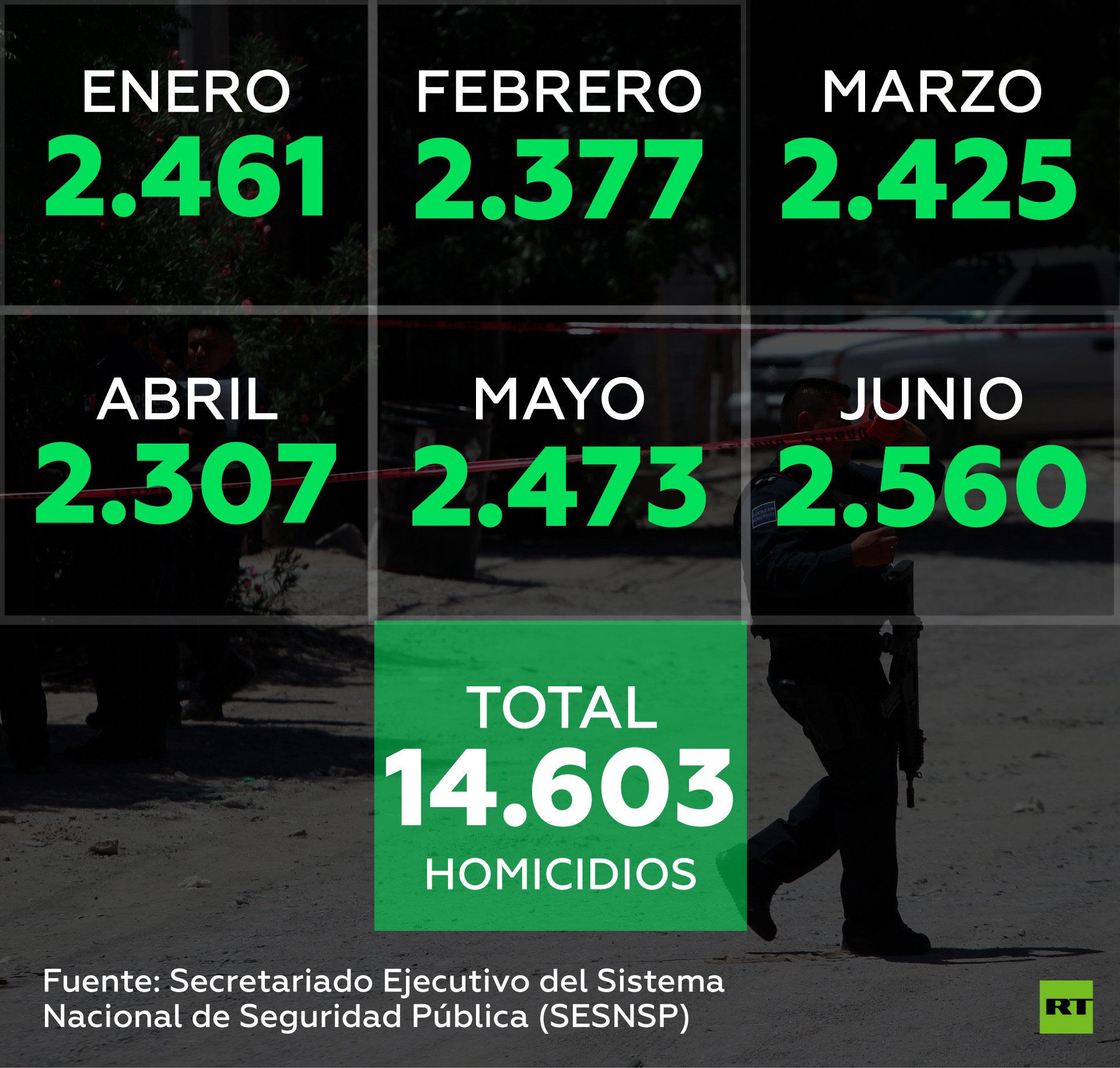 México ha registrado 14.603 homicidios entre enero y junio, frente a los 13.985 asesinatos en el mismo periodo del año pasado, lo que supone un nuevo récord histórico, según cifras del Gobierno mexicano.