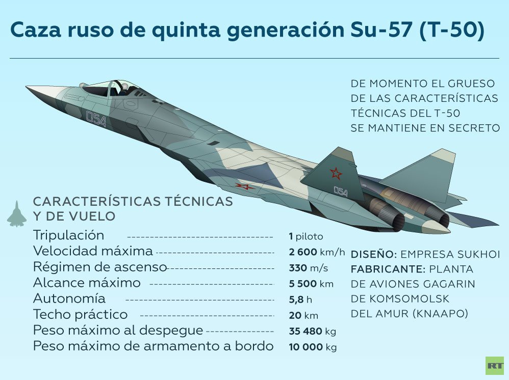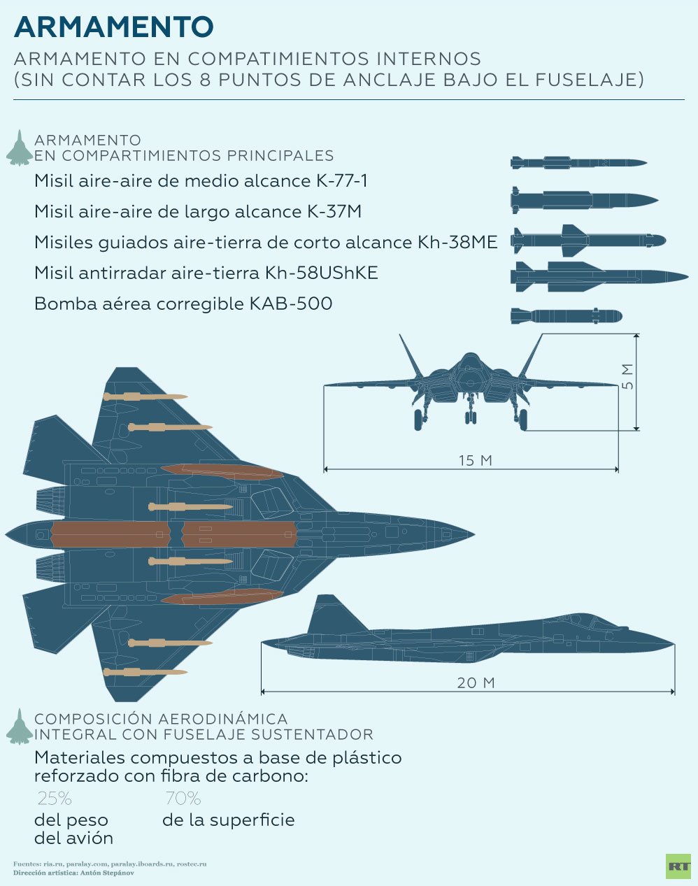 Propulsión: dos motores con empuje vectorial 117S (AL-41F1S, en Rusia), considerados como los de la 'primera etapa' del desarrollo de la aeronave. Su empuje de poscombustión ronda los 15.000 kilogramos de potencia.