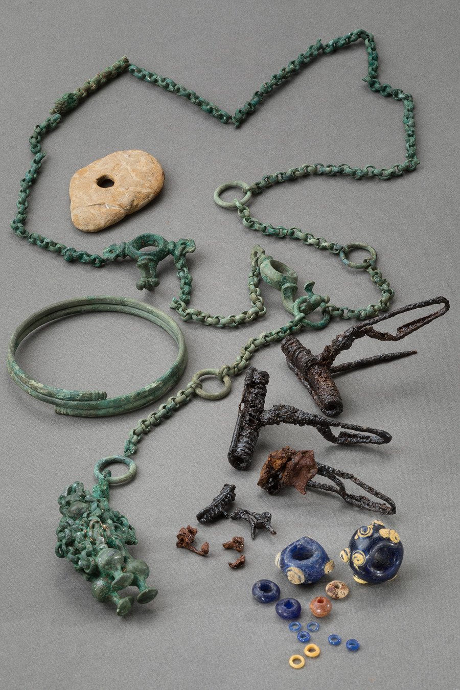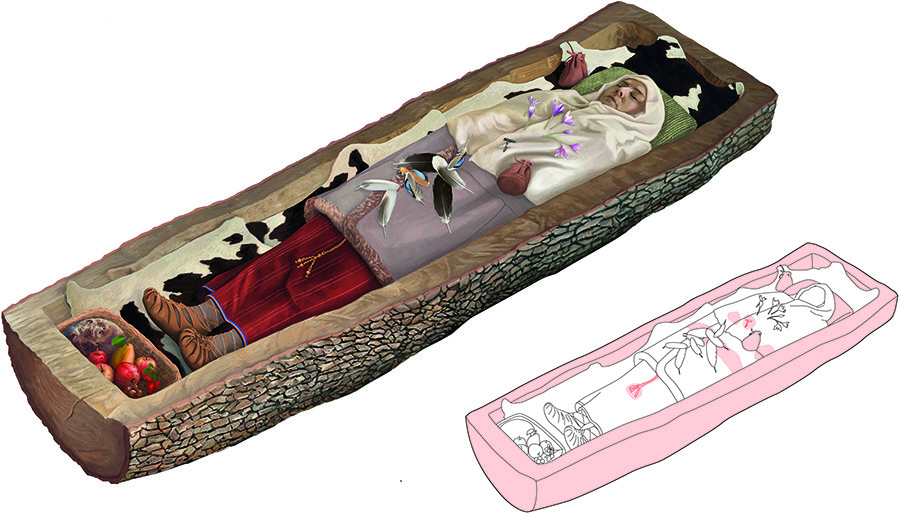 Sobre la base de los restos de textiles, pieles y cuero conservados en la tumba, se sabe que fue enterrada con un vestido de lana, un chal y un abrigo de piel de oveja. Los arqueólogos también descubrieron varias piezas de joyería que incluían pulseras de bronce, un delicado cinturón y un sofisticado collar con cuentas de ámbar y cristal que se sujetaba con dos broches.
