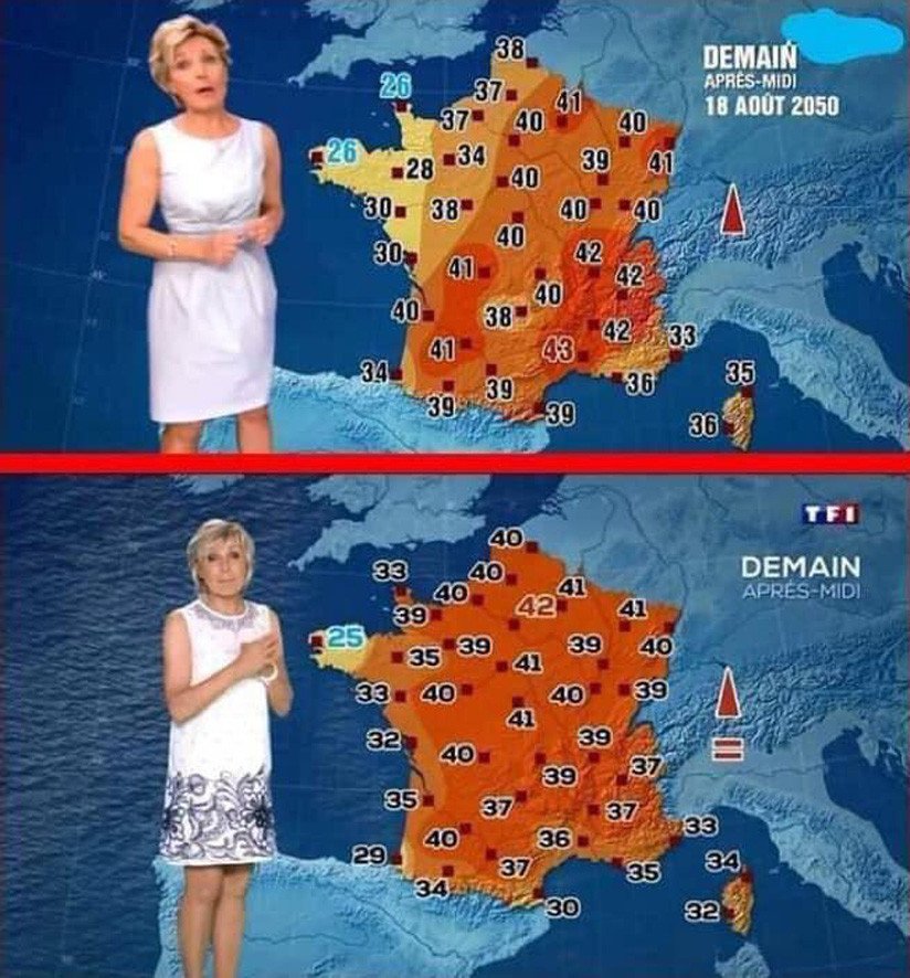 En 2014, el canal francés TF1 empleó algunas de las previsiones más extremas de la Organización Meteorológica Mundial (OMM) para elaborar un informe climático sobre las temperaturas que tendría Francia a mediados de este siglo.