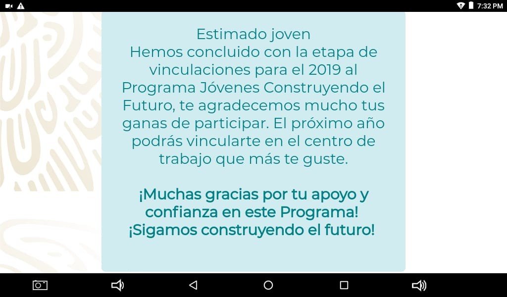 La cuenta de 'Jóvenes Construyendo el Futuro' en Twitter publicó hasta las 20:00 horas (local) del 5 de agosto un mensaje con un video explicativo: "Ya alcanzamos la meta de vinculaciones para 2019. Agradecemos a nuestra comunidad de tutores y becarios por su esfuerzo", se lee.