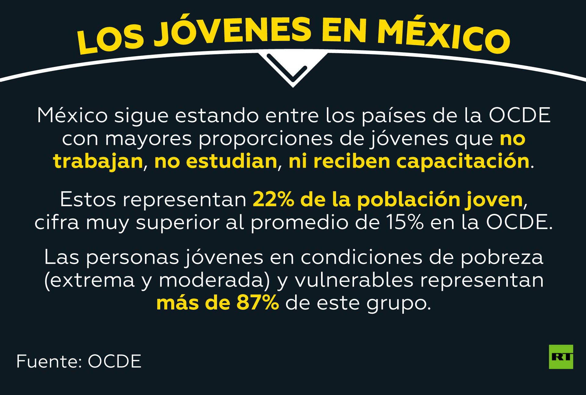 En México, el término 'ni-ni' se ha usado al menos durante los últimos 20 años para etiquetar a los jóvenes que ni estudian ni trabajan. En febrero de 2019, la Organización para la Cooperación y Desarrollo Económicos (OCDE) situó el desempleo juvenil del país latinoamericano en 662.796 personas, la cifra más alta durante los últimos tres meses de 2018.