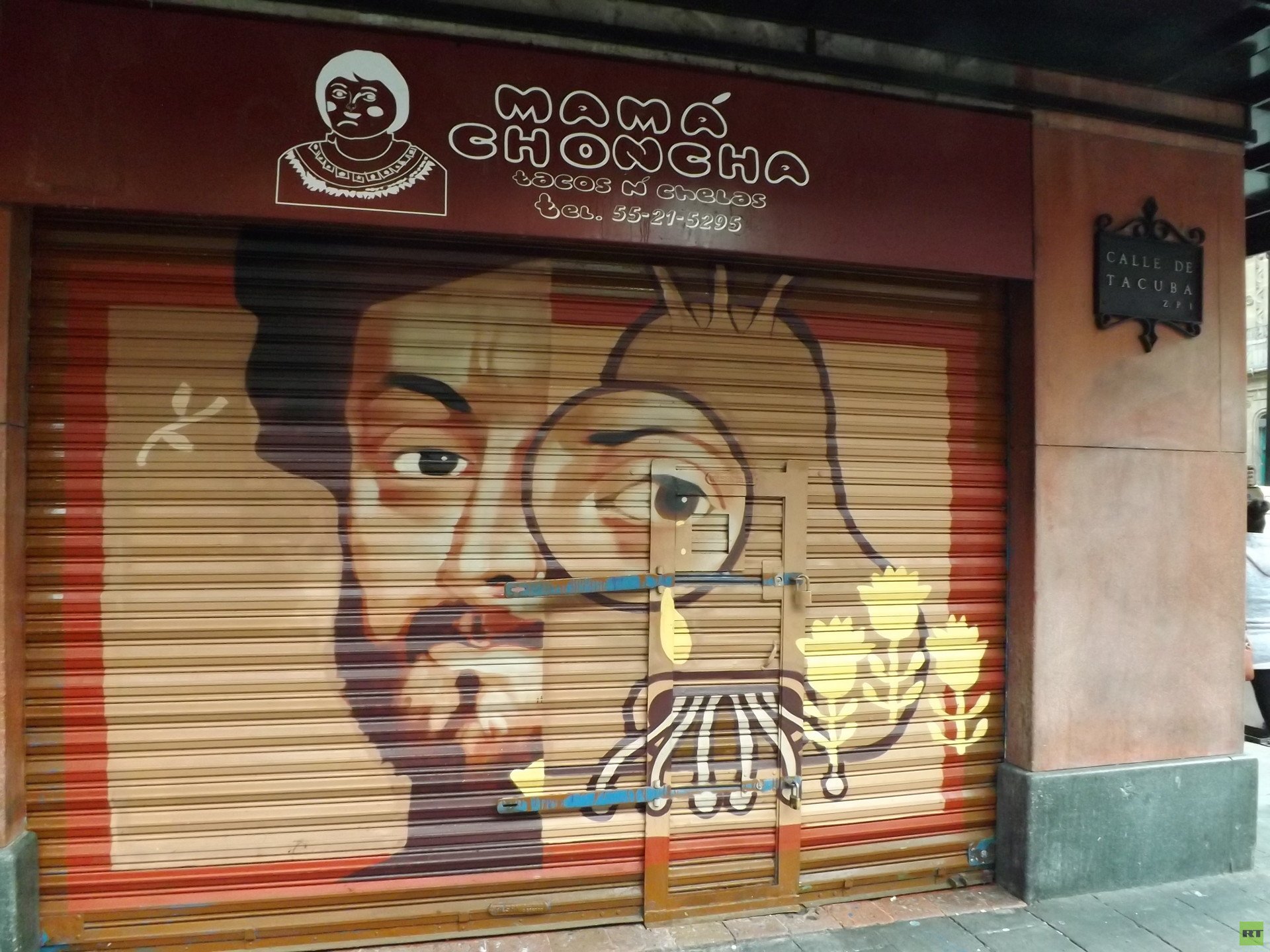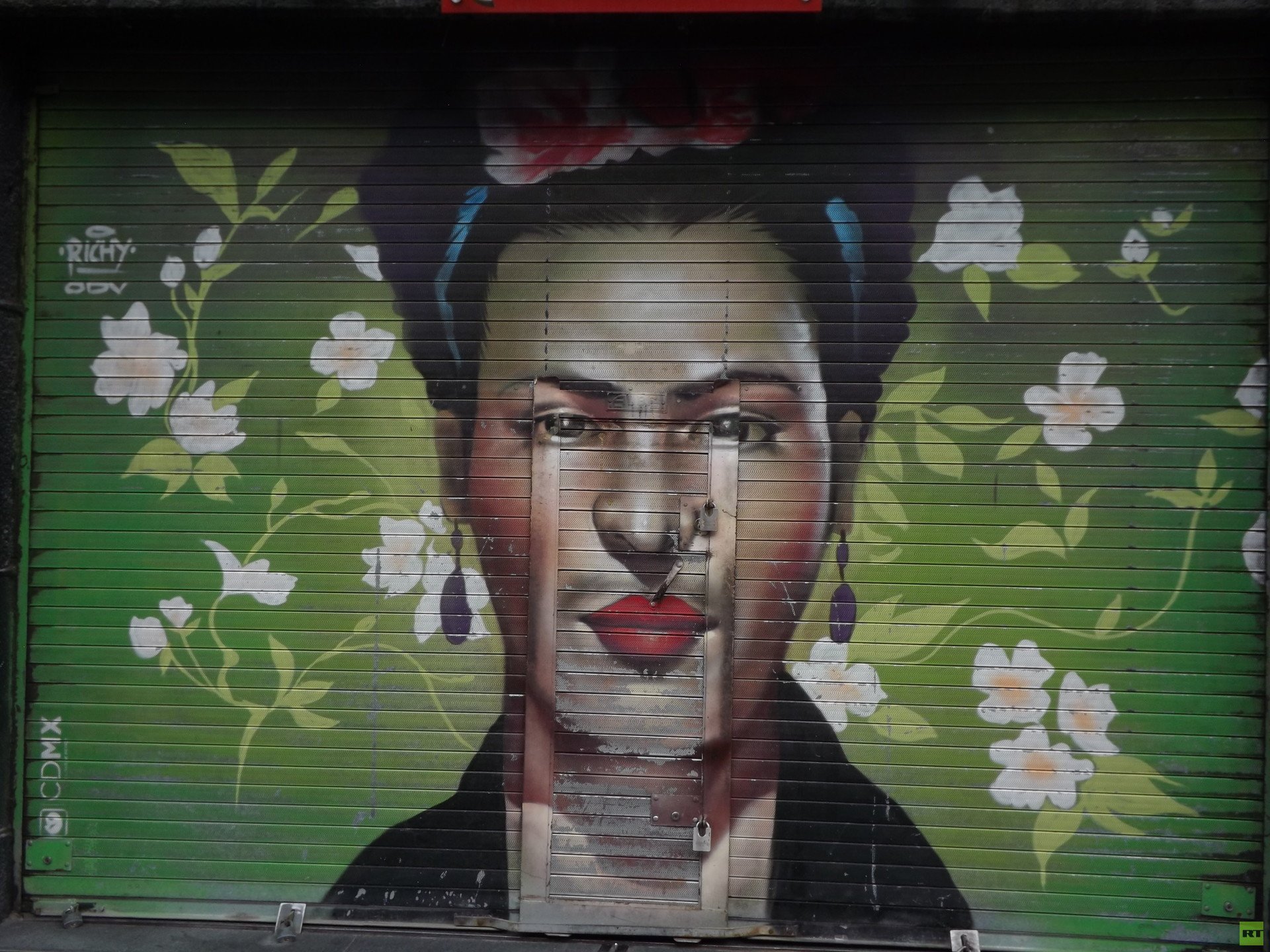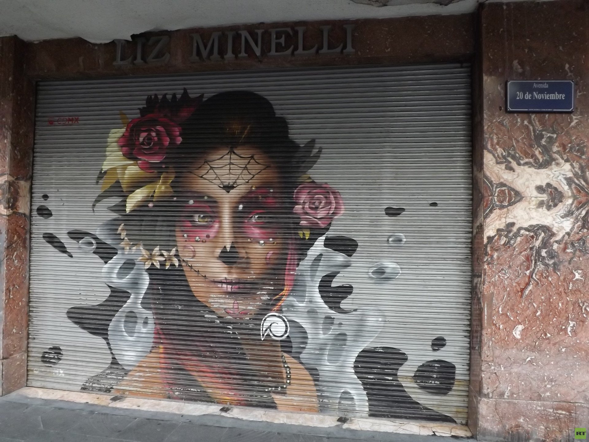 El rostro de la pintora mexicana Frida Kahlo quedó plasmado en las cortinas metálicas de un negocio de vestidos en la calle Mesones del Centro Histórico de Ciudad de México. A unas cuantas calles de allí, está pintado en un local una calavera con un sombrero de charro que baila mientras otra calaca —como le llaman en México— toca un instrumento musical; a su lado, dos esqueletos humanos chocan sus tarros aparentando decir "¡salud!".
