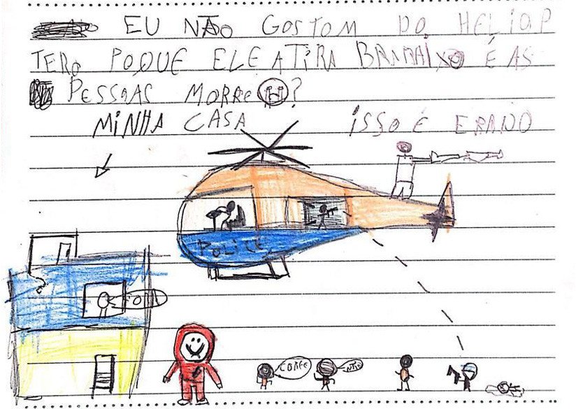 Las dibujos son elocuentes: un policía blanco dispara contra una persona negra. Un helicóptero de las fuerzas de seguridad bombardea desde lo alto diferentes casas. Armas largas que imitan ametralladoras accionan contra una familia. Los mensajes también acompañan a las imágenes: "Eso está mal". "Tengo miedo de salir a la calle"."Queremos paz en Maré".