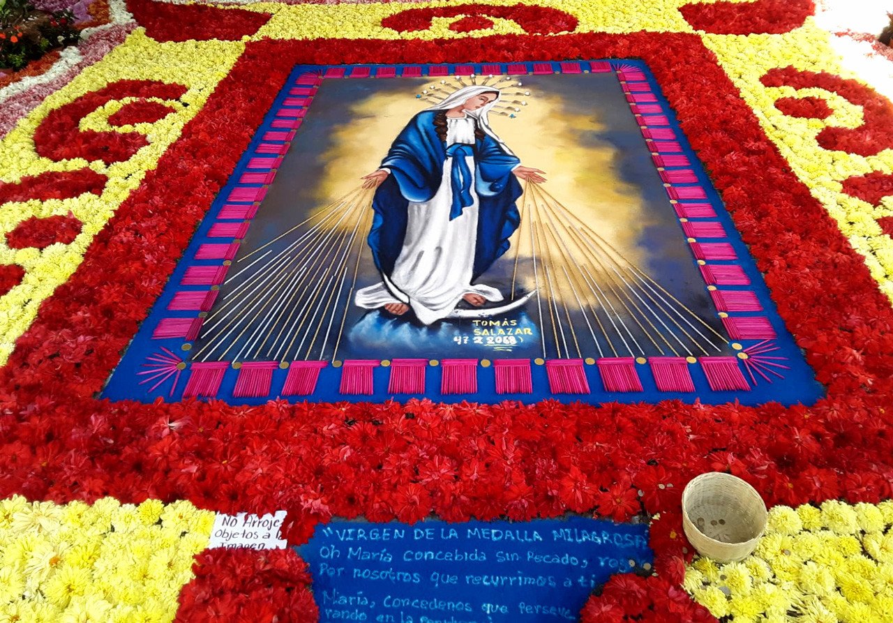 Según esta historia, una vez que concluyó la procesión, cesaron las lluvias y, por ello, comenzaron a realizarse año con año, aunque se suspendieron entre 1914 y 1941 por la persecución religiosa. "Para darle dimensión, los artesanos empezaron a hacer tapetes y alfombras llenas de flores", ahonda Molina, parada junto a una alfombra floral dispuesta en el atrio de la basílica de la señora de la Caridad.