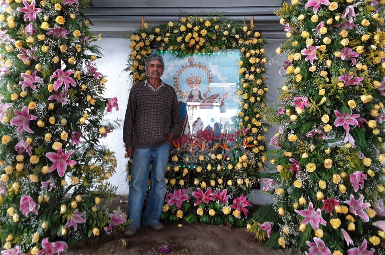 Un anciano que encabeza al grupo que construirá la alfombra floral entrega dulces a los niños, que se congregan en torno al espacio donde él y su equipo pondrán manos a la obra, algo que hace desde su niñez con la enseñanza de su bisabuelo.