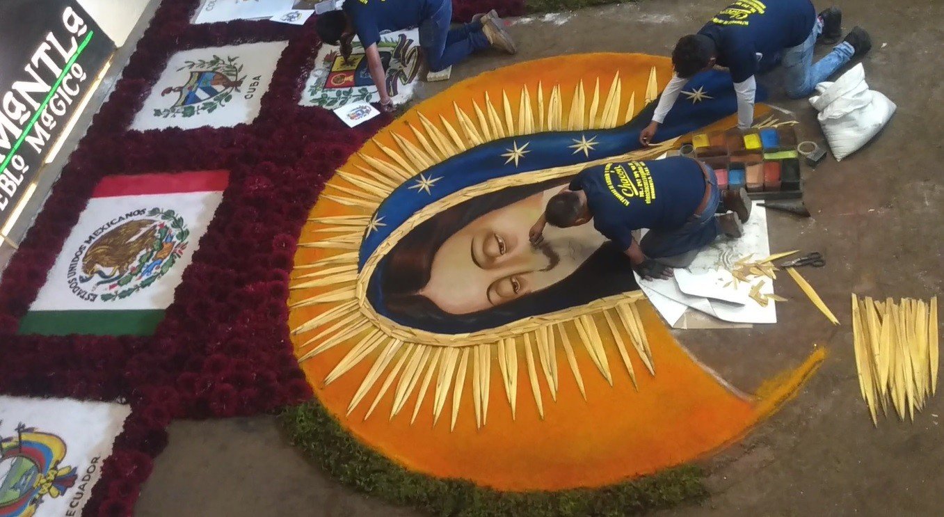 En el museo, el maestro Efrén Chacón, el alfombrista más reconocido del estado y que ha llevado este arte efímero a diversos festivales en Europa, sombrea a mano alzada el rostro de la virgen de Guadalupe en aserrín y arenilla de colores. Su alfombra es la más esperada en 'La noche que nadie duerme'. "Es un trabajo que conlleva mucho cariño, fe, nos tomará alrededor de 12 horas, es el rostro de la virgen rodeado de los escudos de los países más católicos de Latinoamérica", refiere Efrén que esta tarde es observado por decenas de personas apostadas incluso en el segundo piso del recinto para seguir el proceso.