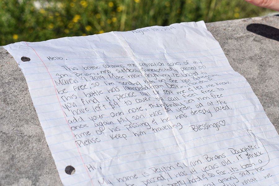 "Este frasco contiene las cenizas de cremación de mi hijo, Brian, quien falleció repentina e inesperadamente el 9 de marzo de 2019", decía una de las notas. "Más que nada, ansiaba ser libre, así que le envío a una última aventura". La botella fue lanzada al océano desde las costas de la localidad Destin (Florida) y los restos eran de un hombre de Texas, que murió de un ataque cardíaco pocos días después de cumplir 39 años.
