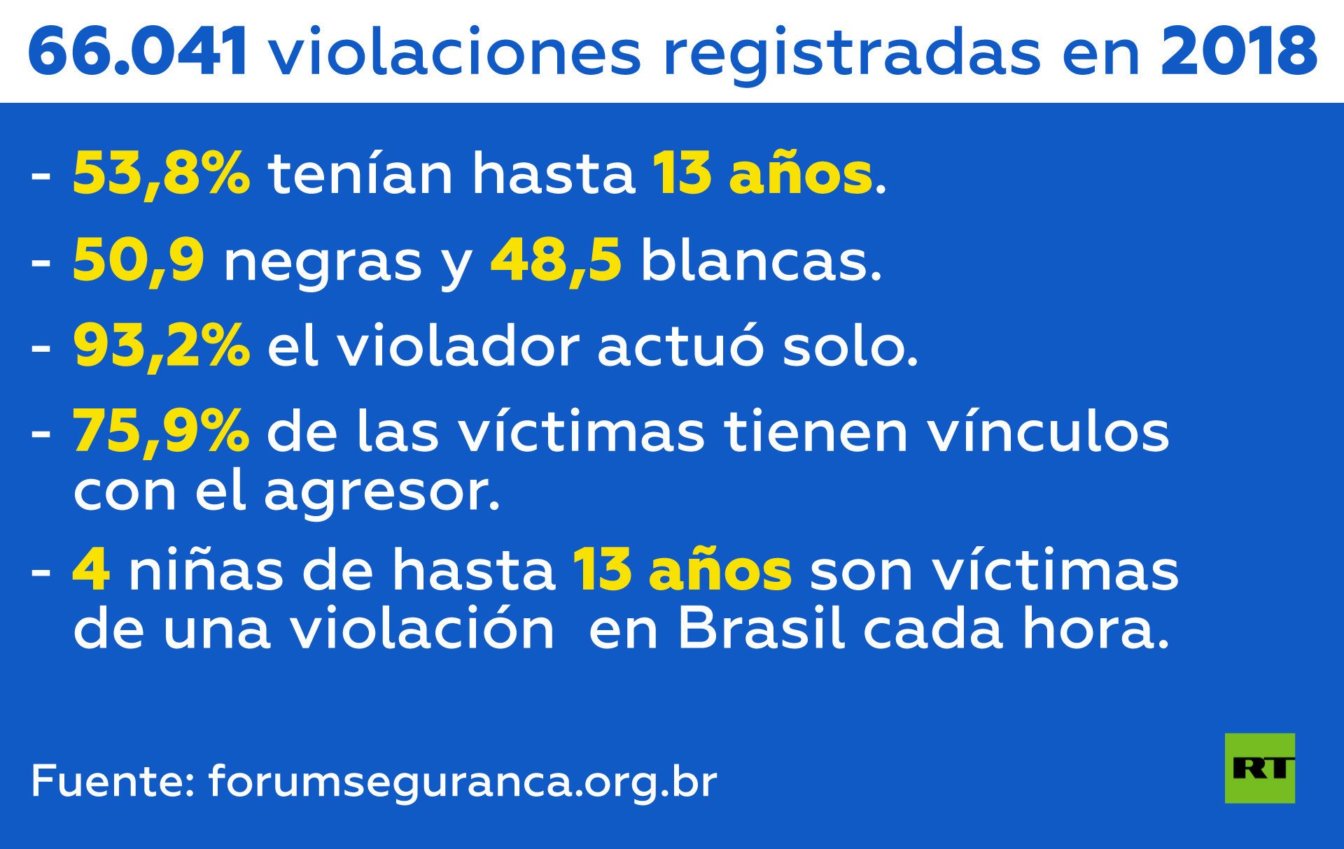 Cuatro niñas que no superan los 13 años son víctimas de una violación sexual cada hora en Brasil, según un estudio del Foro Brasileño de Seguridad Pública (FBSP). De las 66.041 violaciones registradas en 2018, una cifra récord, el 53,8% fue contra niñas en esa franja de edad.