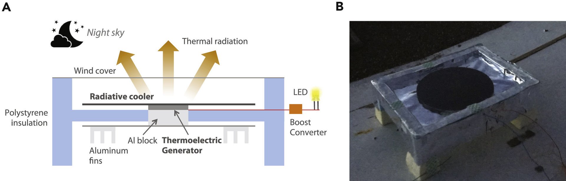 El dispositivo funciona por enfriamiento radiactivo, el proceso que permite que los objetos liberen calor después de que se haya puesto el sol. Para comprobar su funcionamiento, los investigadores lo colocaron en un tejado a medida que la temperatura descendía algunos grados bajo cero. Observaron que la parte superior del aparato se enfriaba más rápido que la inferior, permitiendo convertir esta temperatura en electricidad con la ayuda de un generador termoeléctrico.
