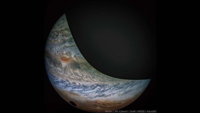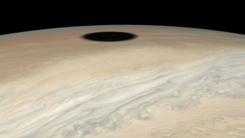 El ingeniero de software del Laboratorio de Propulsión a Chorro de la NASA, Kevil Gill, también compartió una imagen en 360 grados de Júpiter captada por Juno, en la que se observa el círculo de sombra.