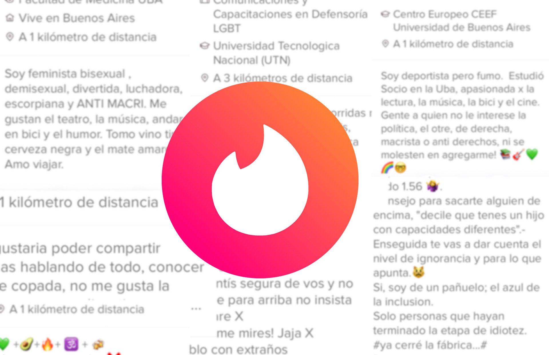 El activismo en Tinder ya se había evidenciado desde el año pasado con el debate por la legalización del aborto y la efervescencia del feminismo. Por eso son usuales las fotos enmarcadas en pañuelos verdes (a favor del derecho al aborto) o celestes (en contra). Mensajes como "Si sos feminazi no tenemos nada que hablar" o los más modernos: "Estoy en proceso de deconstrucción", "hombre deconstruide". El debate veganos/vegetarianos/carnívoros todavía no invade la aplicación.