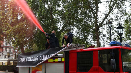 Los manifestantes acusan al Gobierno británico de invertir grandes sumas de dinero en la explotación de combustibles fósiles y proyectos intensivos de carbono, aumentando 11 veces el presupuesto destinado para este tipo de actividades desde 2017 a 2018. "Paren de financiar la muerte climática", reza el texto de la pancarta utilizada por la organización.