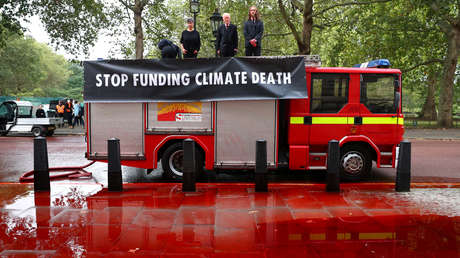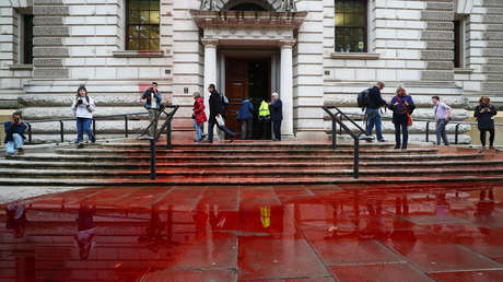 Varios manifestantes del movimiento Extinction Rebellion, que lucha a favor de la conservación ambiental, utilizaron un camión de bomberos para rociar 1.800 litros de sangre falsa frente al edificio del Ministerio de Finanzas en Londres (Reino Unido). El hecho ocurrió este jueves alrededor de las 10 de la mañana.