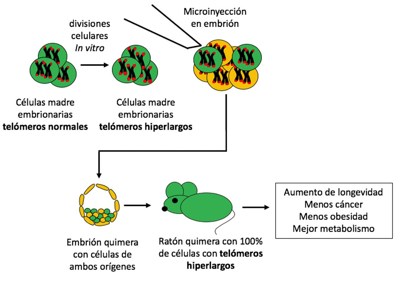 Investigadores del Centro Nacional de Investigaciones Oncológicas (CNIO) realizaron las pruebas en los roedores sin modificarlos genéticamente y por selección obtuvieron una muestra de animales con telómeros "hiperlargos" en el 100% de sus células. Para comparar, observaron a otro grupo de ratones con telómeros de varias longitudes, lo habitual en la población general de los animales.
