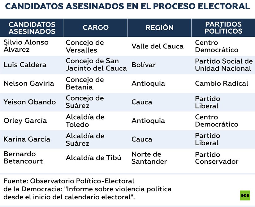 Como Karina García y Yeison Obando, al menos otros cinco candidatos —PARES estima nueve, en total— a Concejos y alcaldías fueron asesinados durante el proceso electoral. La criminalidad no discrimina partido político.
