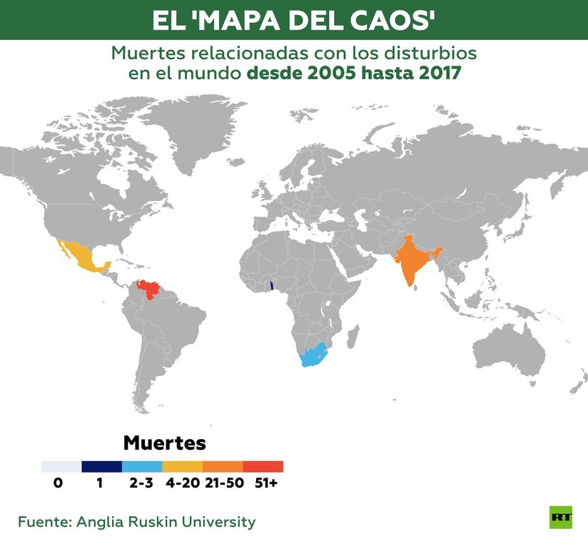 Un grupo de científcos de la Universidad Anglia Ruskin (el Reino Unido) ha creado un 'Mapa del Caos', que registró las muertes en el mundo relacionadas con los disturbios violentos por la escasez de alimentos, combustible y agua, y ha advertido que el número de fallecimientos por estas razones podrá aumentar en el futuro próximo.