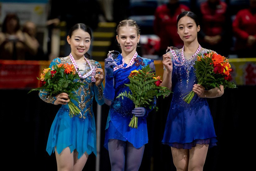 La patinadora rusa Alexandra Trúsova se llevó el oro en un evento del Gran Premio de patinaje artístico sobre hielo de la Unión Internacional de Patinaje este sábado en Kelowna, Canadá.