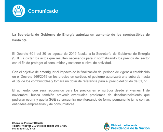 El Gobierno de Argentina autorizó este jueves un incremento del 5 % en los combustibles —naftas y gasoil—, a fin de "amortiguar" el impacto del fin del congelamiento de precios, que rige hasta el 14 de noviembre.