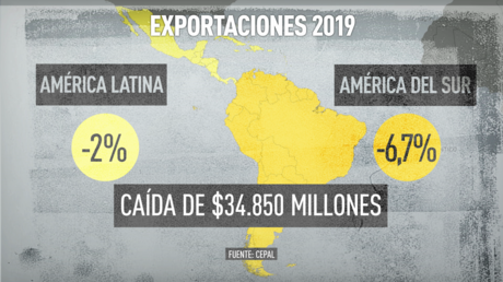 Así, en América Latina se proyecta que el valor de las exportaciones regionales de bienes para el final de este año caerá el 2 %. Concretamente, en América del Sur se proyecta una mayor caída en el valor de sus exportaciones para el mismo período, que puede alcanzar el 6,7 %, lo que representa un cifra de 34.850 millones de dólares, de acuerdo con los datos de la Comisión Económica para América Latina y el Caribe (CEPAL).