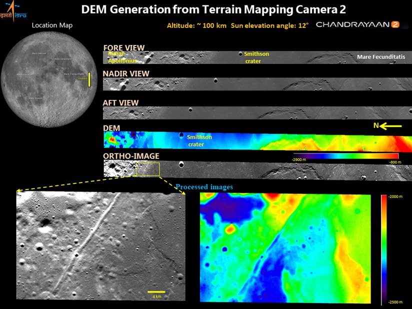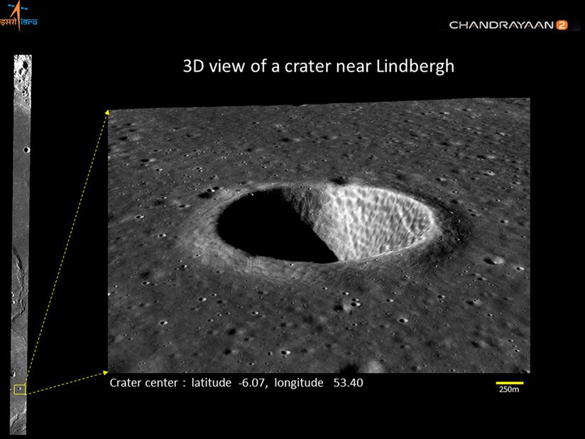 Una imagen tridimensional de la superficie, compartida por la ISRO en Twitter, representa un cráter de impacto próximo al de Lindbergh, conocido desde las misiones Apollo (EE.UU.). En otra, publicada en el sitio web de la agencia, se aprecian las visiones frontal, nadir, térmica, óptica y artística de una misma franja de la superficie tomadas por las cámaras del Chandrayaan-2.