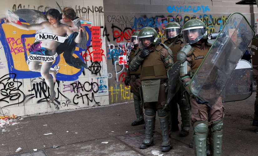 Al respecto, en una pared cercana a la avenida Providencia, se observa un grafiti de dos carabineros ocultándose detrás de un Jesucristo, quien tiene un ojo vendado, en protesta por las cientos de personas que han perdido sus ojos durante las manifestaciones. Sobre los personajes, hay un escrito que dice: "No los perdones, saben perfectamente lo que hacen".