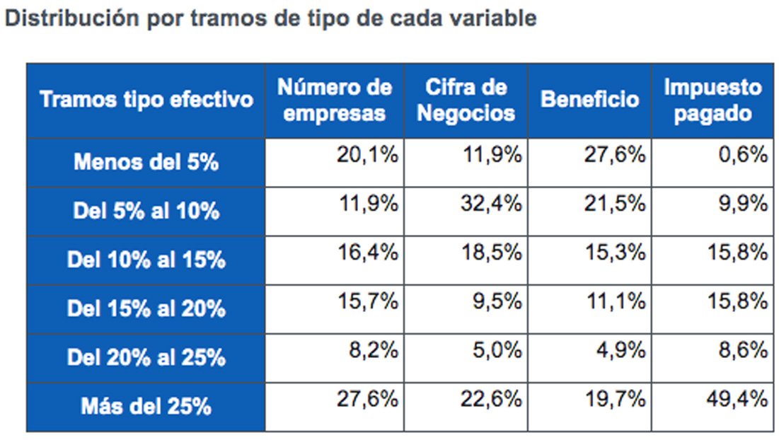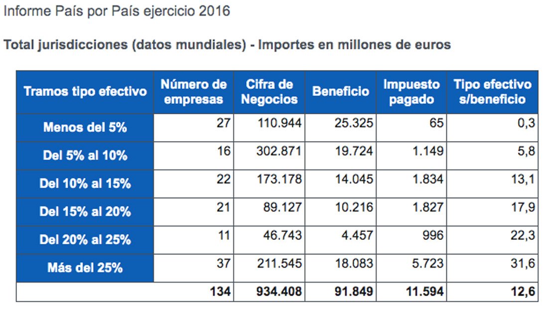 Esto se debe a que, pese a la existencia del mencionado grupo de compañías que no llegan a tributar ni un 5 %, también se da la situación opuesta: la de 37 grandes empresas, que en total obtuvieron un beneficio de 18.083 millones, y que pagaron nada menos que un 31,6 % en concepto de Impuesto de Sociedades, al haber aportado una cifra conjunta, en todos los países en los que operan, superior a los 5.700 millones.