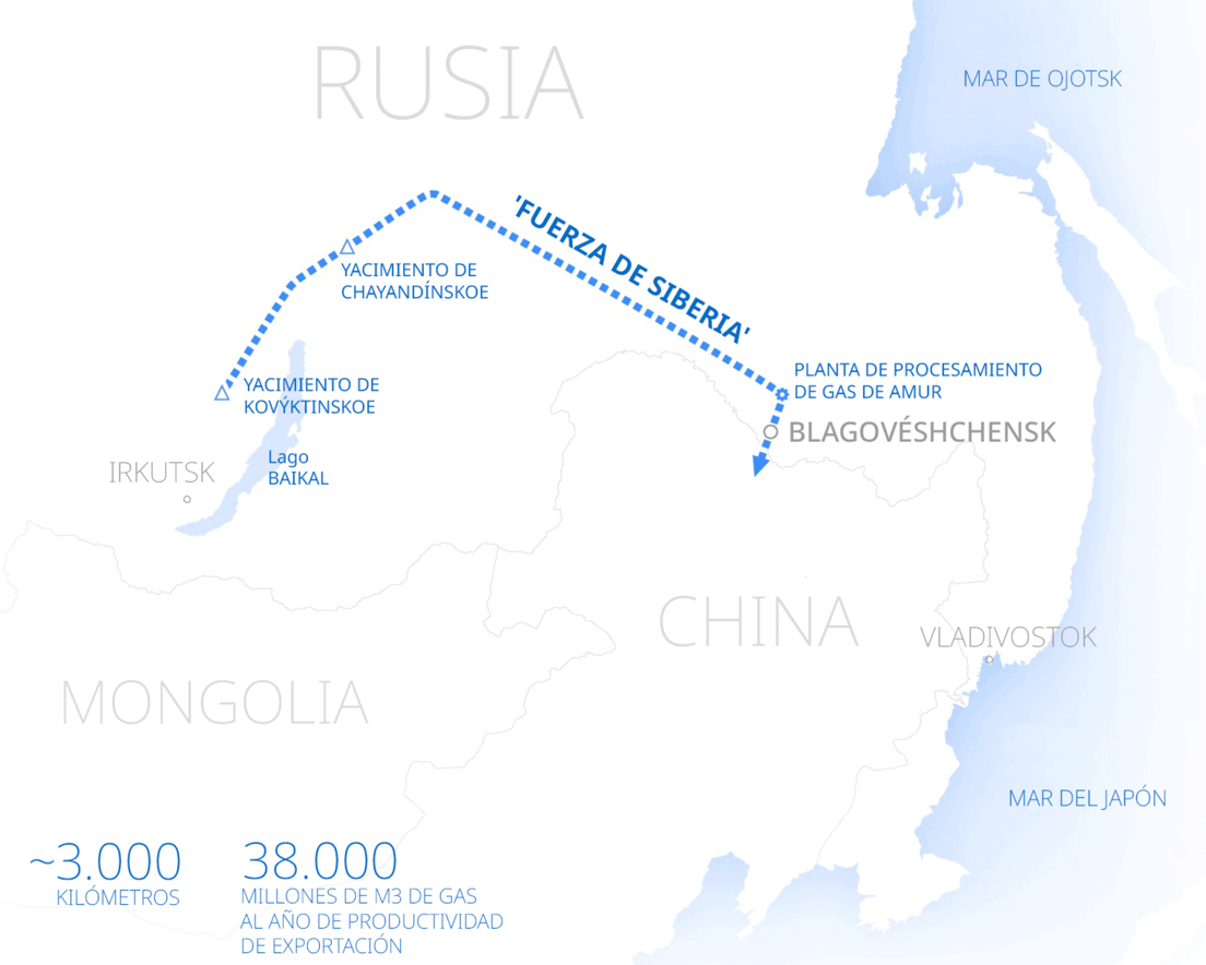 Fuerza de Siberia es el sistema de transmisión de gas más grande en el Lejano Oriente ruso, a través del cual el gas de los campos en Yakutia y la región de Irkutsk se transportará tanto al mercado interno ruso (a través de Jabárovsk hasta Vladivostok) como a China (a través de Blagovéshchensk).