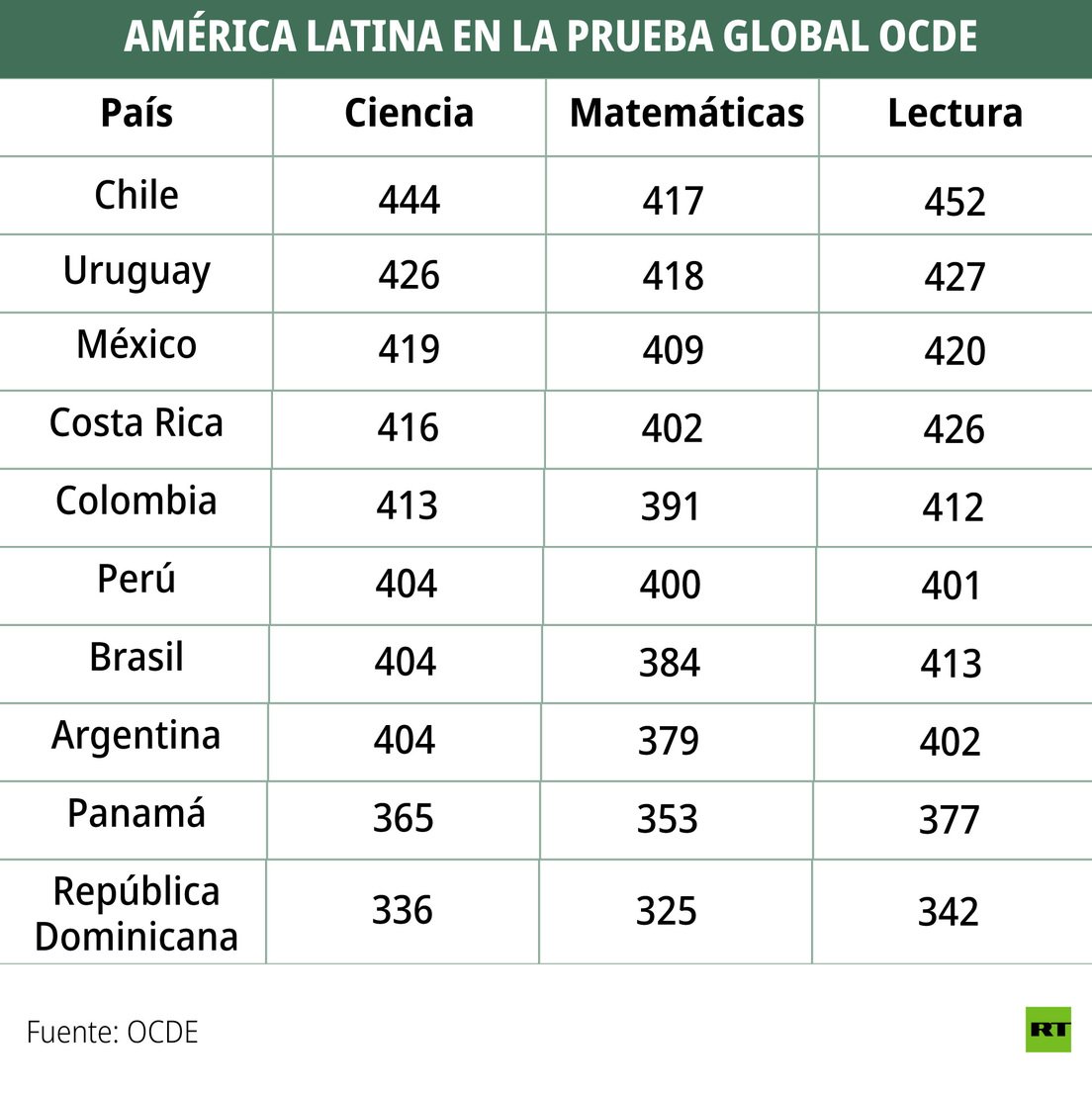 El peor evaluado de la región fue República Dominicana, con 336 puntos en ciencias, 325 en matemáticas y 342 en lectura.