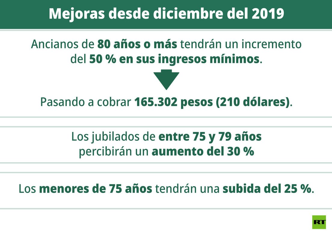 Desde diciembre de este año, los ancianos de 80 años o más tendrán un incremento del 50 % en sus ingresos mínimos, pasando a cobrar 165.302 pesos (210 dólares). Al mismo tiempo, los jubilados de entre 75 y 79 años percibirán un aumento del 30 %, mientras que los menores de 75 tendrán una suba del 25 %.