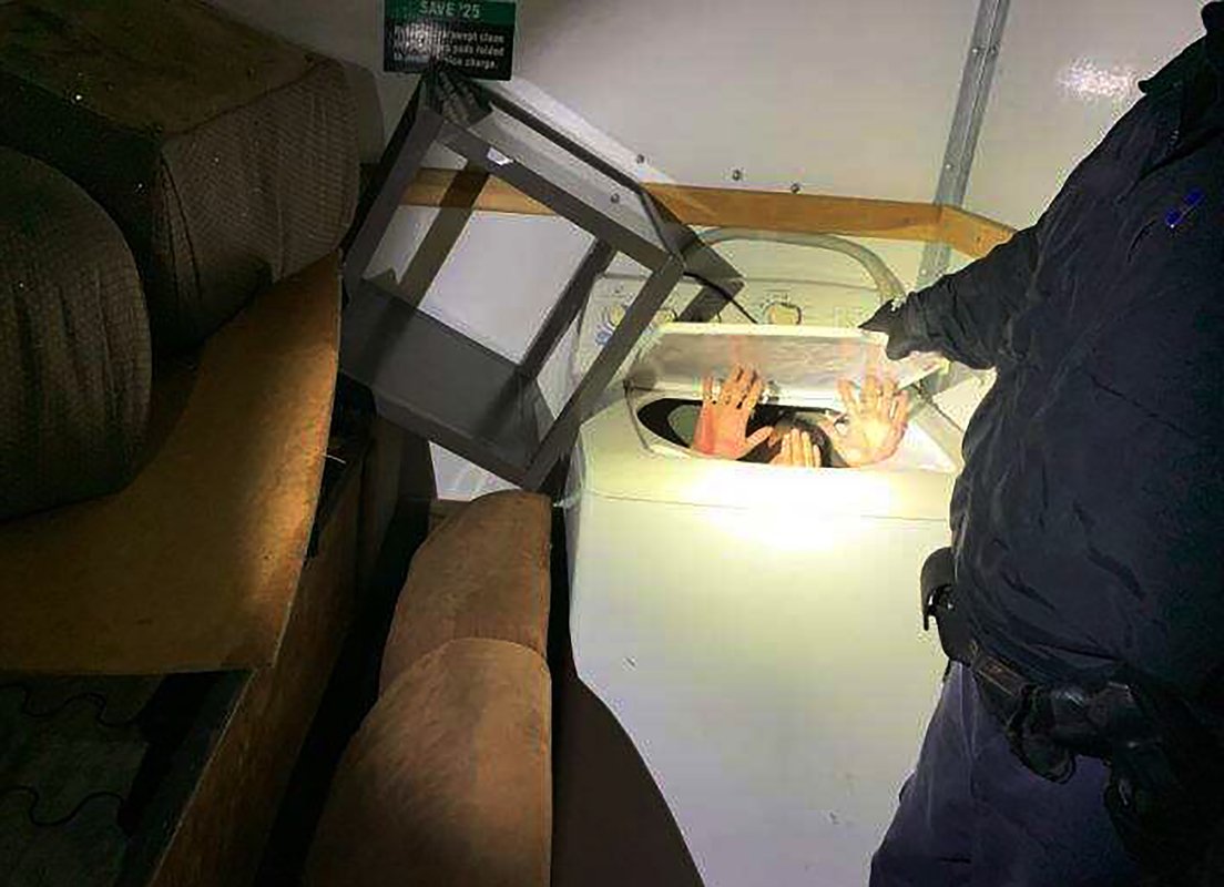 En las fotos proporcionadas por el ICE se puede ver a una persona metida dentro de un cofre de madera y a otras dos dentro de una lavadora, con las manos levantadas.