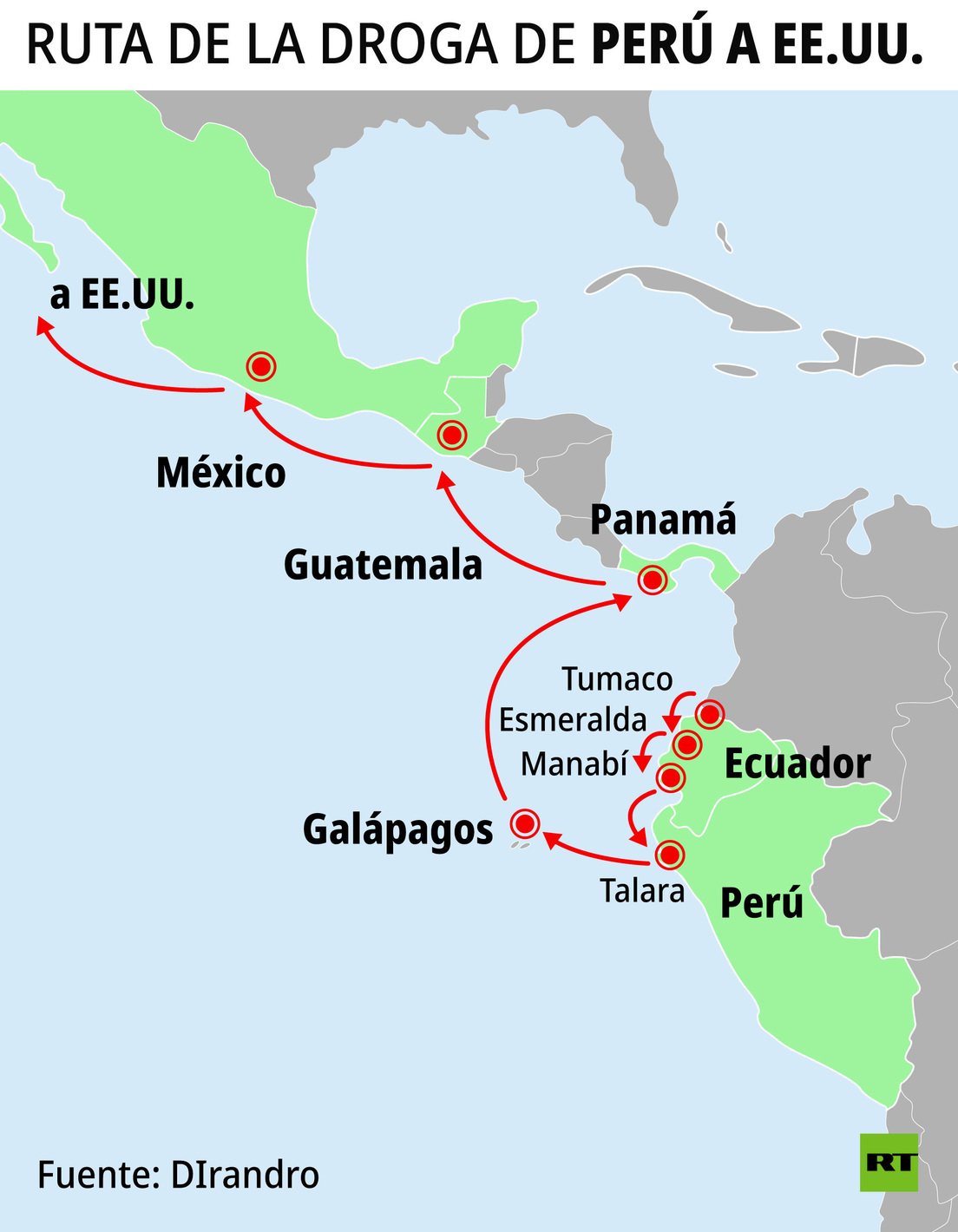Desde Perú se exporta anualmente cerca de 400 toneladas de cocaína. La mayor parte de la droga se envía por mar. De acuerdo con La República, la mercadería ilícita proviene de Ecuador, y tras cruzar la frontera peruana, se dirige luego a Galápagos y desde allí continúa hacia el norte, pasando por Panamá, Guatemala y México, hasta llegar a la costa oeste de EE.UU.