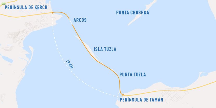 - 19 kilómetros de vías: 6 de ellos están sobre las aguas del estrecho de Kerch, el resto, incluyendo la isla de Tuzla en medio del estrecho, sobre tierra